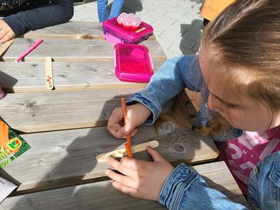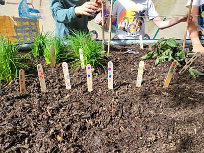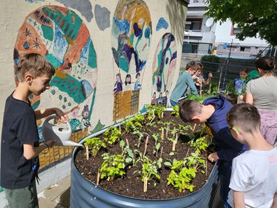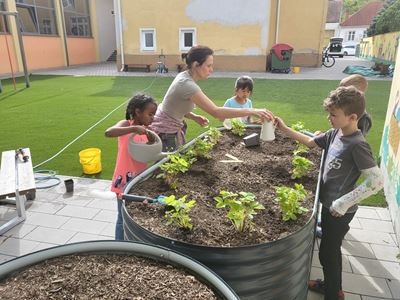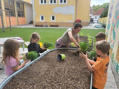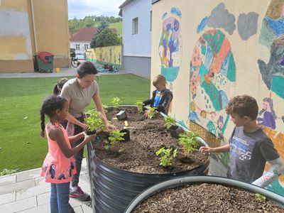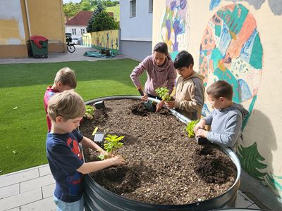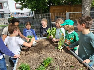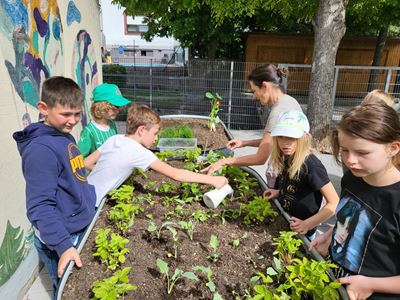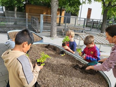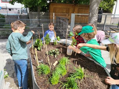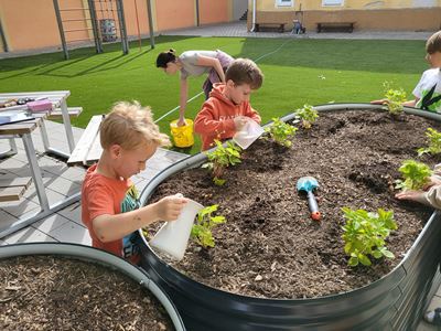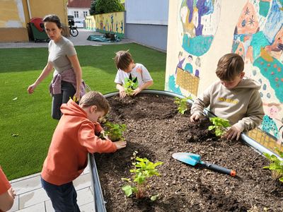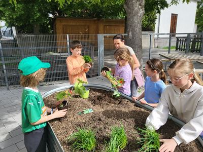 Nachdem die Hochbeete befüllt waren, ging es mit dem Bepflanzen weiter. Kohlrabi, Karotten, Radieschen, Schnittlauch, Walderdbeeren, Erbsen, Minze, Snackgurken sowie essbare und bienenfreundliche Blumen wurden mit viel Engagement gepflanzt. Die Kinder können so mitverfolgen, wie sich die Pflanzen entwickeln und wie sie gepflegt werden müssen, um eine erfolgreiche Ernte zu haben.